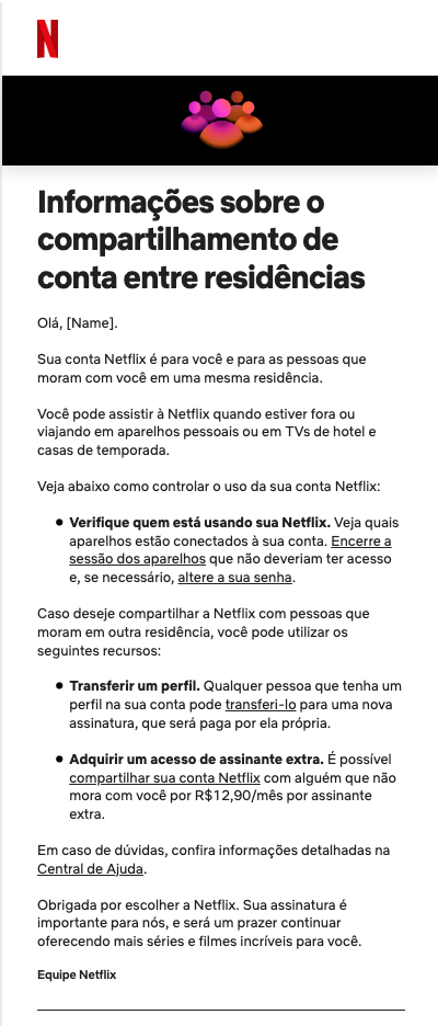 “A conta Netflix deve ser usada por uma única residência. Todas as pessoas que moram nesta mesma residência podem usar a Netflix onde quiserem, seja em casa, na rua, ou enquanto viajam. Além disso, podem aproveitar as vantagens dos novos recursos como Transferir um Perfil e Gerenciar Acesso e Aparelhos“, explicou a nota.