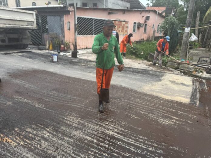 Na rua Tupi, no loteamento Campo Dourado, a prefeitura atuou em pronta resposta após o rompimento de um trecho da rede de drenagem profunda, ocasionado pelo acúmulo irregular de lixo no igarapé da região, que provocou a obstrução da galeria e a abertura de uma cratera na via. As equipes recuperaram a estrutura da galeria subterrânea e concluíram o serviço com a aplicação de massa asfáltica, estendendo a manutenção para outros pontos da rua que apresentavam desgaste no pavimento.