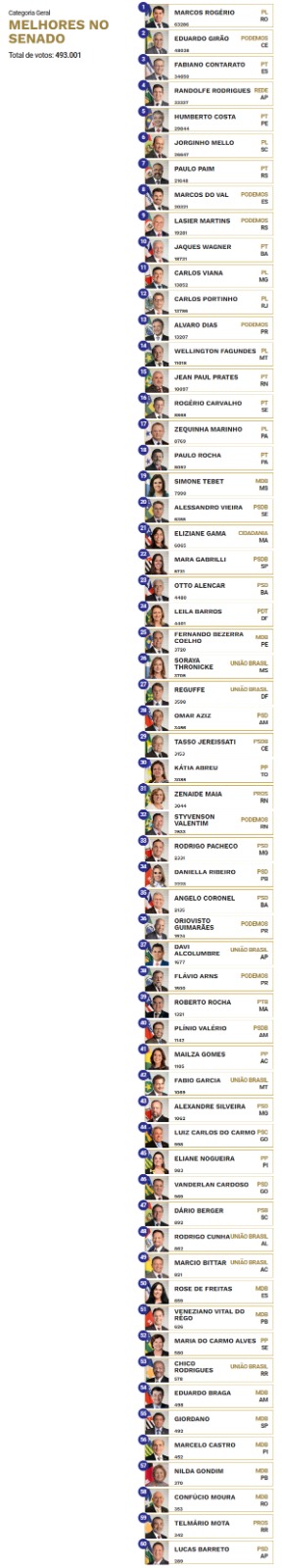 Omar Aziz aparece em 16º lugar, com 853 votos, Eduardo Braga (MDB) no 42º lugar, com apenas 177 votos e Plínio Valério (PSDB) recebeu 88 votos e aparece no 52º na lista.