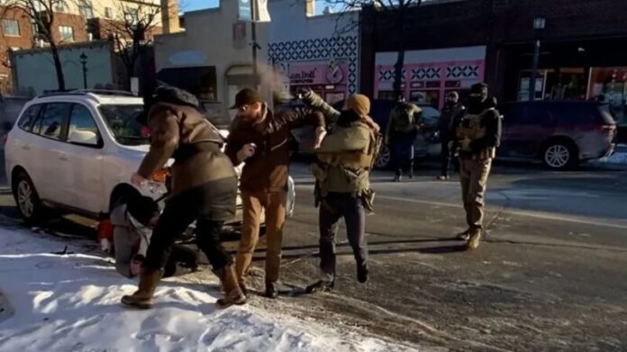 “Estava segurando o celular na mão direita e a mão esquerda, vazia, estava erguida acima da cabeça enquanto tentava proteger a mulher que o agente do ICE tinha acabado de empurrar, tudo isto enquanto era atingido por spray pimenta”, acrescentou.