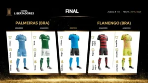 A Conmebol definiu os uniformes que serão utilizados por Palmeiras e Flamengo na final da Libertadores, em 29 de novembro, no Estádio Monumental de Lima, no Peru. As equipes vestirão os seus uniformes principais.