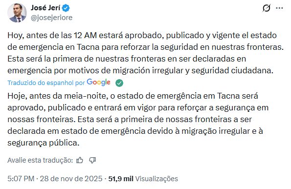 O presidente do Peru, José Jerí, convocou uma reunião urgente do Conselho de Ministros e anunciou a declaração de estado de emergência na fronteira com seu país vizinho ao sul, o Chile. A medida extrema foi tomada nessa sexta-feira (28/11) diante de uma crise na fronteira após o bloqueio da rodovia Tacna-Arica por migrantes vindos de várias cidades chilenas.