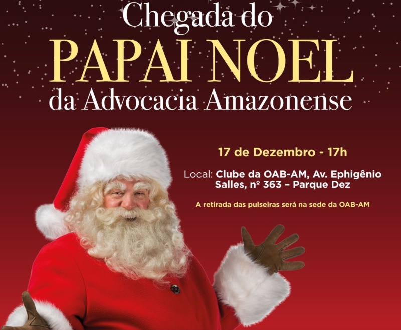 advocacia amazonense, receberá, de forma inédita, um espetáculo natalino com a “Chegada do Papai Noel”, realizado pela Ordem dos Advogados do Brasil – Seccional Amazonas (OAB-AM), por meio da Comissão de Proteção à Criança e ao Adolescente. O evento acontece, neste sábado, dia 17 de dezembro, às 17h, no Clube da OAB, localizado na Avenida Efigênio Salles, n° 363 – Parque Dez de Novembro.