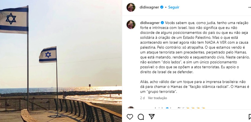 Em sua rede social, a apresentadora Didi Wagner publicou uma foto da bandeira de Israel. Na legenda, ela escreveu: “Vocês sabem que, como judia, tenho uma relação forte e intrínseca com Israel. Isso não significa que eu não discorde de alguns posicionamentos do país ou que eu não seja solidária à criação de um Estado Palestino, Mas o que está acontecendo em Israel agora não tem nada a ver com a causa palestina. Pelo contrário: só atrapalha. O que estamos vendo é um ataque terrorista sem precedentes, perpetrado pelo Hamas, que está matando, rendendo e sequestrando civis. Neste cenário, não existem “dois lados”, e sim um único posicionamento possível: o dos que se opõem a atos terroristas. Eu apoio o direito de Israel de se defender. Aliás, acho válido dar um toque para a imprensa brasileira: não dá para chamar o Hamas de ‘facção islâmica radical’. O Hamas é um ‘grupo terrorista'”