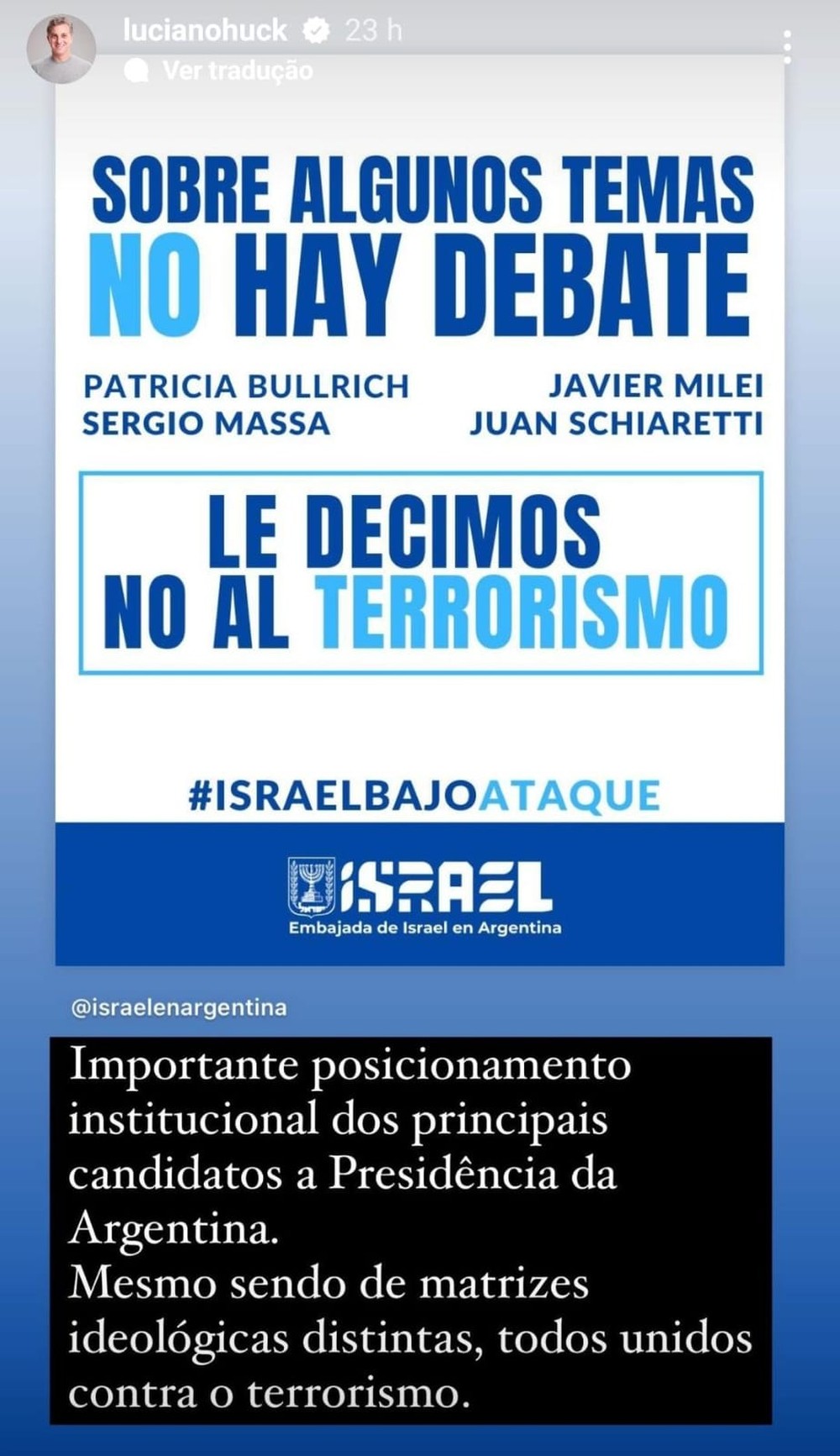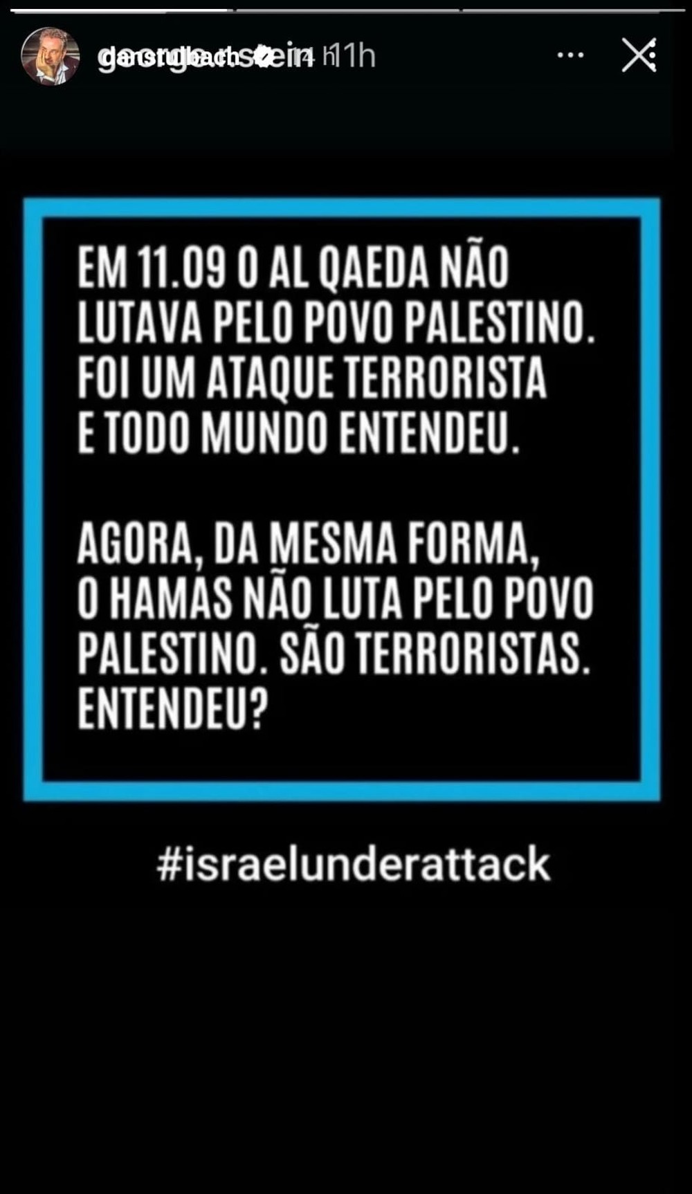 Após o ataque do grupo extremista Hamas a Israel, várias personalidades judias passaram a se manifestar em suas redes sociais sobre o conflito. É o caso de Luciano Huck, Caco Ciocler, Dan Stulback, entre outros, que se manifestaram contra o ataque terrorista.