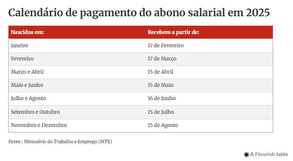 O repasse dos valores do abono salarial de 2025 (referente ao ano-base de 2023) começou em 17 de fevereiro. Nos meses anteriores, o calendário contemplou os nascidos em janeiro, fevereiro, março, abril, maio e junho.