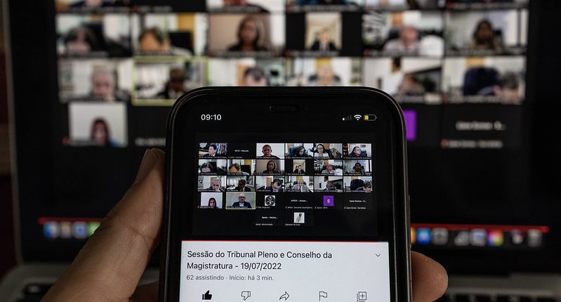 #PraTodosVerem – a foto que ilustra a matéria mostra o detalhe da mão de uma pessoa segurando um telefone celular em cuja tela se vê a transmissão, pela plataforma YouTube, da sessão do Pleno desta terça-feira, com uma espécie de mosaico que mostra os membros do colegiado participando de forma remota da reunião. Ao fundo, a mesma imagem está projetada na tela de um notebook.