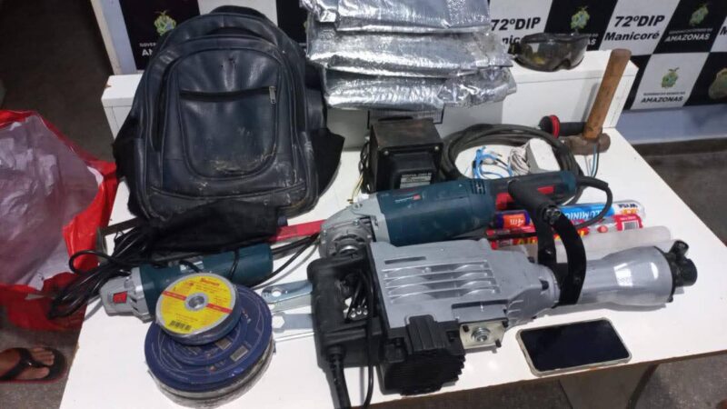 Com o grupo, os policiais apreenderam ferramentas utilizadas no crime, como lixadeira, martelete, esmerilhadeira, discos de corte, rolos de manta térmica e até papel alumínio, além de dois aparelhos celulares.