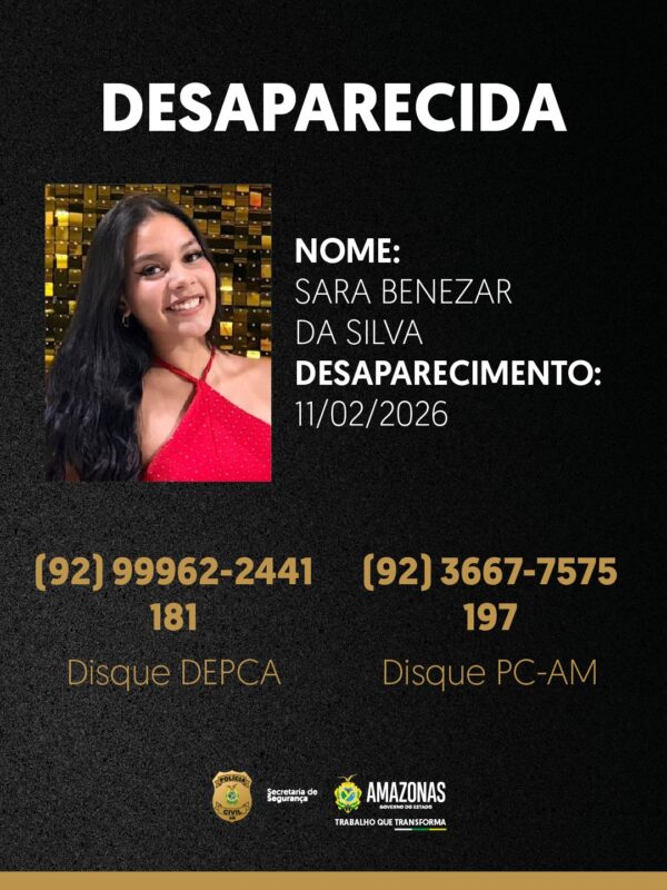 A PC-AM solicita que quaisquer informações que possam contribuir para a localização de Sara Benezar da Silva sejam repassadas pelos números (92) 99962-2441, da Depca; 197; (92) 3667-7575, da PC-AM; ou 181, da Secretaria de Segurança Pública do Amazonas (SSP-AM).