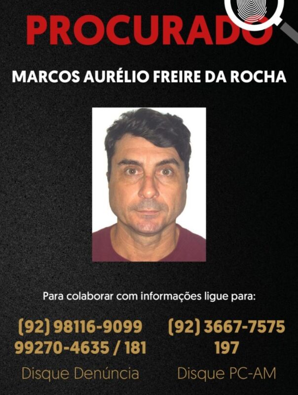 A Polícia Civil do Amazonas (PC-AM), por meio do 9º Distrito Integrado de Polícia (DIP), solicita a ampla divulgação da imagem de Marcos Aurélio Freire da Rocha, de 50 anos, investigado em mais de 50 Boletins de Ocorrência (BOs) pelos crimes de estelionato, apropriação indébita, falsidade ideológica e falsidade documental.