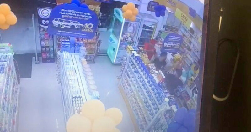 Vídeos de câmera de segurança circulam nas redes sociais mostrando o momento em que dois homens entram na farmácia a atiram no policial. Um suspeito estava de camisa e boné da cor vermelha e calça escura.