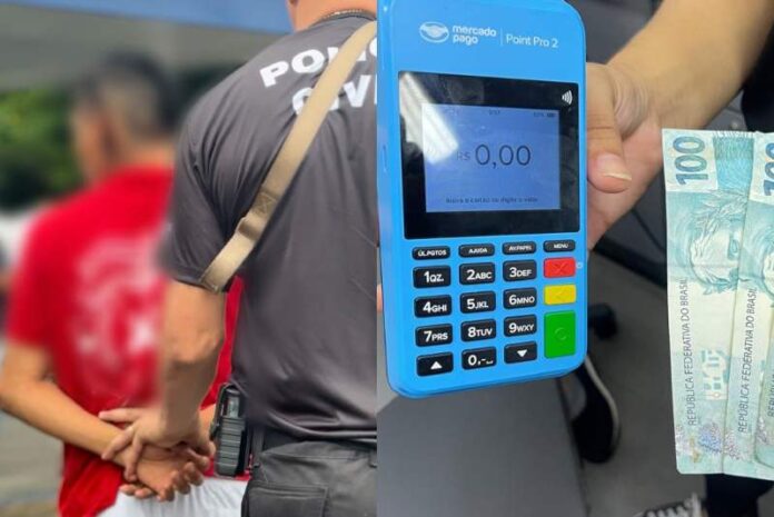 Segundo o delegado, durante a prisão do homem, a equipe policial encontrou 300 reais em cédulas falsas e uma máquina de cartão.