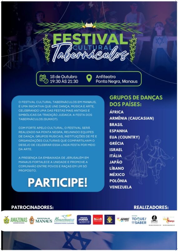 Essa história será narrada, por meio das danças e artes, neste sábado, dia 18 de outubro, a partir das 19h, no anfiteatro da Ponta Negra, zona oeste de Manaus, com a realização do Festival Cultural de Tabernáculos 2025. O evento é gratuito. A proposta é mergulhar na simbologia e no significado espiritual da festividade, unindo tradição religiosa com expressões artísticas contemporâneas.