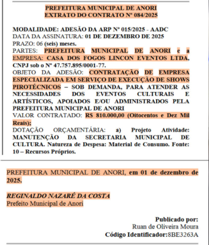 O extrato do contrato Nº 084/2025, assinado pelo prefeito Reginaldo Nazaré da Costa, conhecido como “Régis Nazaré” não especifica em que tipo de evento, dia e mês para o pipocar (estampido) de seus foguetes, bombas e canhões.