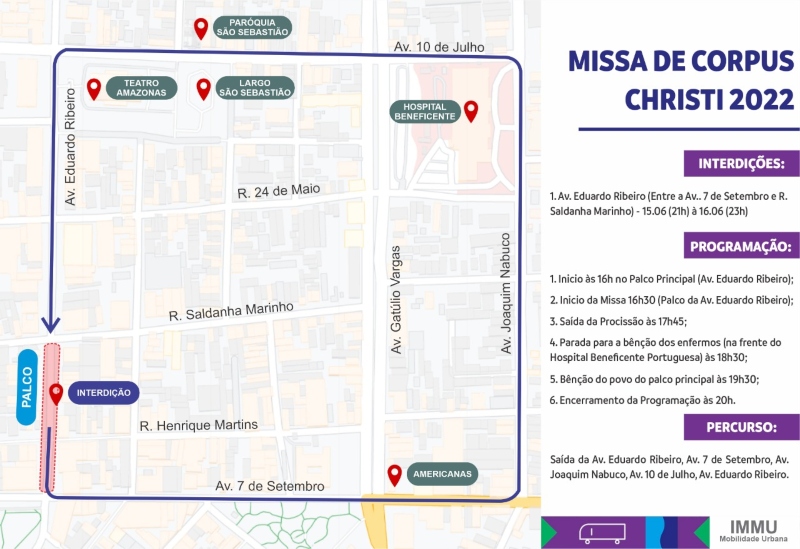 A Prefeitura de Manaus, por meio do Instituto Municipal de Mobilidade Urbana (IMMU), alerta a população para mudança temporária no fluxo de trânsito no Centro devido à realização da Missa de Corpus Christi e da procissão, nesta quinta-feira, 16/6, às 16h. A avenida Eduardo Ribeiro será interditada no trecho entre a 7 de Setembro e a rua Saldanha Marinho, a partir das 21h desta quarta-feira, 15/6.
