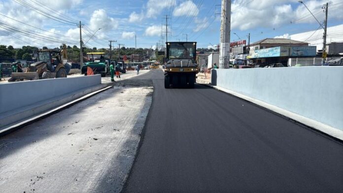 A Prefeitura de Manaus, por meio da Secretaria Municipal de Infraestrutura (Seminf), avançou nesta segunda-feira, 16/6, com a aplicação da camada asfáltica na trincheira do complexo viário Rei Pelé, localizada na antiga Bola do Produtor, na zona Leste. A intervenção acontece no trecho que liga a avenida Itaúba às avenidas Camapuã e Autaz Mirim, um ponto estratégico para a mobilidade urbana da zona Leste.