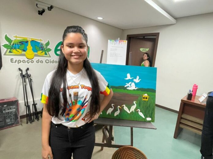 Para a artista Júlia Abreu, de 18 anos, autora da obra que retrata “O voo das garças na beleza amazônica”, a pintura ajudou e motivou a fazer algo diferente.