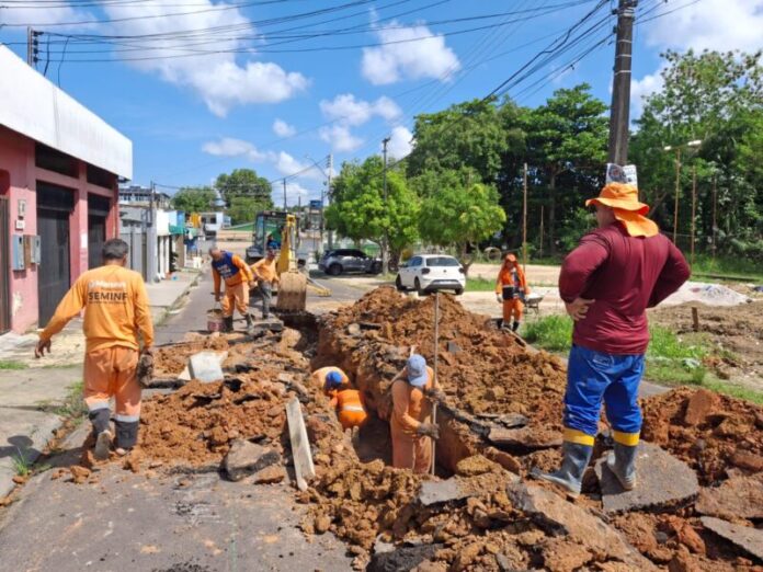 A Prefeitura de Manaus, por meio da Secretaria Municipal de Infraestrutura (Seminf), inicia o ano de 2026 com a execução do seu cronograma de obras para melhorar a qualidade de vida da população. Durante esta sexta-feira, 2/1, as equipes executam a manutenção em trecho de rede de drenagem profunda da rua Waldemar Pereira de Souza, conjunto Belvedere, no bairro Planalto, zona Centro-Oeste da capital.