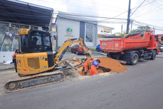 A Prefeitura de Manaus, por meio da Secretaria Municipal de Infraestrutura (Seminf), realizou, nesta sexta-feira, 21/11, uma intervenção emergencial na rede de drenagem profunda da rua Araxá, no bairro Flores, zona Centro-Sul. O serviço foi necessário após um vazamento na tubulação da concessionária de água provocar a fuga de material e o consequente danificar a estrutura da rede de drenagem da prefeitura.