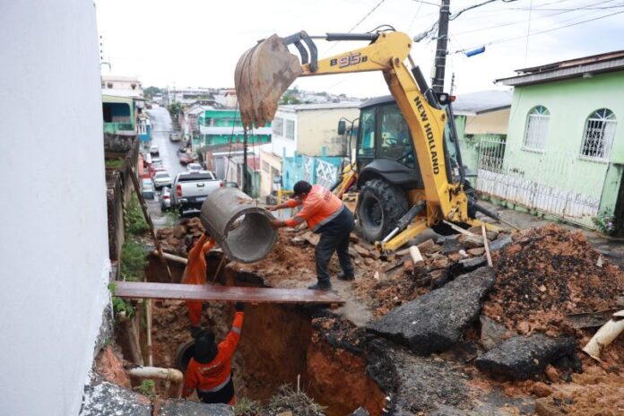 A Prefeitura de Manaus , por meio da Secretaria Municipal de Infraestrutura (Seminf), executa, nesta sexta-feira, 4/7, a recuperação de uma importante rede de drenagem profunda na rua Padre Severo, no bairro São Jorge, zona Oeste da capital. O sistema foi comprometido por ligações irregulares conectadas à rede de drenagem da prefeitura, associadas ao acúmulo de lixo no interior do equipamento público.