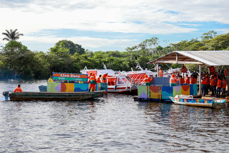 A Prefeitura de Manaus, por meio da Secretaria Municipal de Limpeza Urbana (Semulsp), entregou, na sexta-feira, 3/6, três coletores flutuantes de lixo para as comunidades rurais de Manaus na marina do Davi, estrada da Ponta Negra, zona Oeste. Na ocasião, houve a participação dos Garis da Alegria, que fizeram apresentações lúdicas, com músicas autorais sobre o descarte correto dos resíduos, e a equipe da coleta seletiva fez o recolhimento de materiais recicláveis na área.