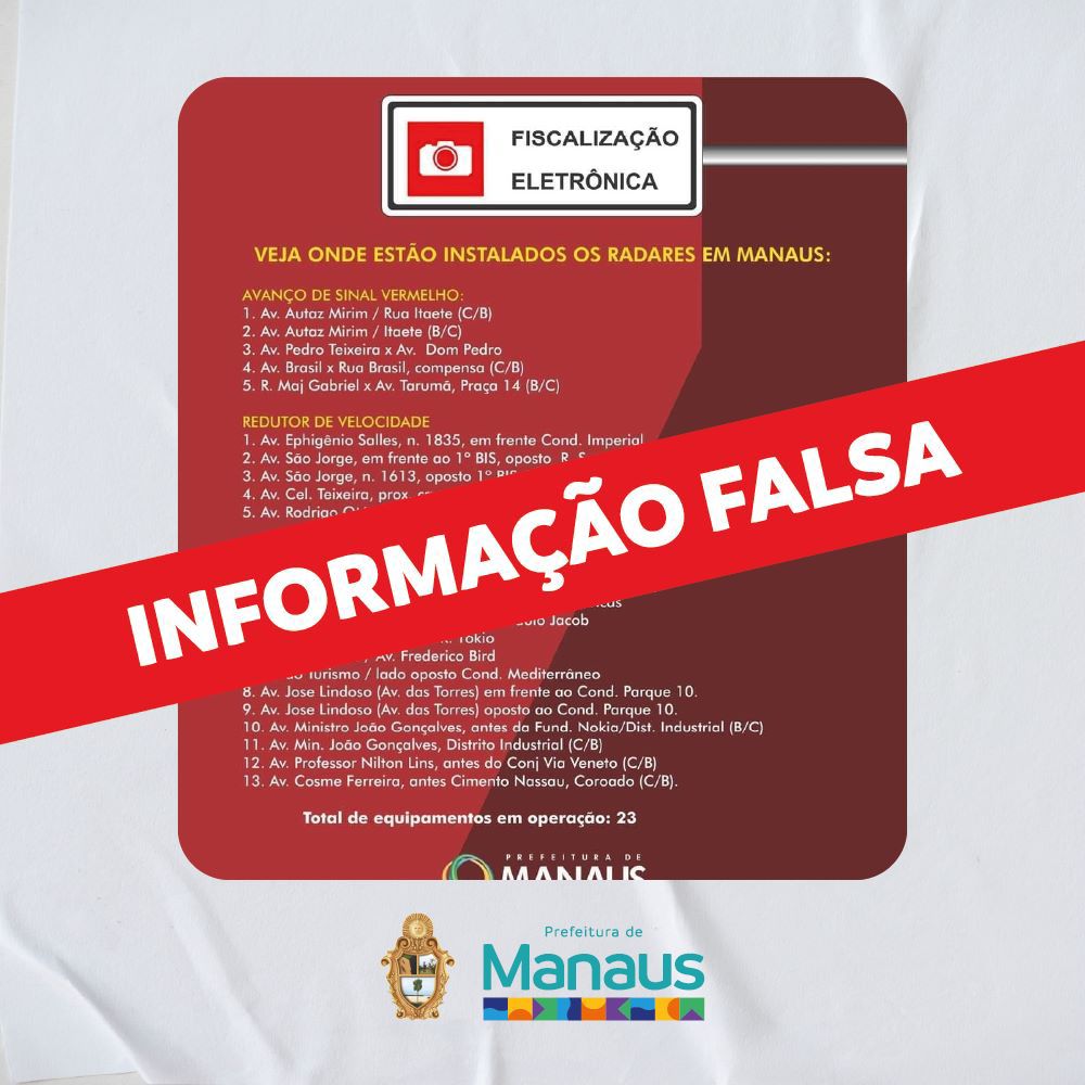 A Prefeitura de Manaus, por meio do Instituto Municipal de Mobilidade Urbana (IMMU), informa por meio de nota, que não procede a informação sobre a instalação de fiscalização eletrônica (radares) em Manaus. As equipes estão nas ruas implantando câmeras de monitoramento que não são utilizadas para autuar, como é o caso de outras que já existem.