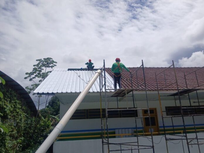 A ação contempla a troca de telhas de barro e de amianto por material metálico termoacústico, que oferece isolamento térmico — reduzindo o calor interno — e isolamento acústico, abafando ruídos externos como os causados pela chuva.