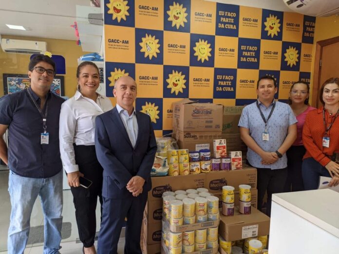 Entre os alimentos doados à instituição estão caixas de leite em pó; caixas de arroz e aveia integral; caixas de cereais; caixas contendo suplemento infantil; entre outros.