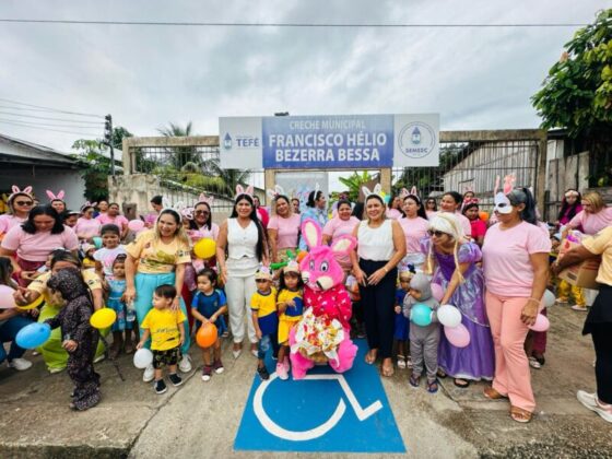 A primeira-dama de Tefé, Kelly Barbosa, participou ativamente da ação “Páscoa da Alegria”, promovida pela Prefeitura por meio da Secretaria Municipal de Assistência Social e da Cidadania (SEMASC), que beneficiou crianças atendidas por creches públicas, pelo Centro de Referência de Assistência Social (CRAS) e por instituições como a APAE, Casa Azul e o Instituto do Autismo.