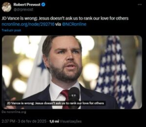 Em uma das ocasiões, Leão XIV republicou uma reportagem que questiona o posicionamento do governo de Donald Trump a respeito dos imigrantes.”JD Vance está errado: Jesus não nos pede para classificar nosso amor pelos outros”, diz título da matéria.