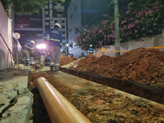 Na área central de Manaus, outra frente de obra está implantando redes coletoras de esgoto. Na rua Silva Ramos (entre as ruas Ferreira Pena e Tarumã), equipes trabalham durante o dia para garantir que os moradores e comerciantes desta parte da cidade tenham acesso ao sistema de esgotamento sanitário.