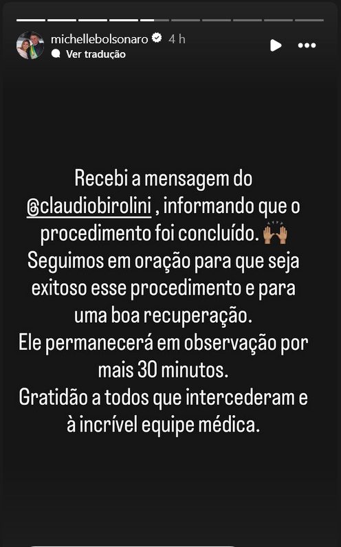 Michelle publicou em suas redes sociais uma mensagem enviada pelo cirurgião geral Claudio Birolini, integrante da equipe médica responsável pelo acompanhamento do ex-presidente. Segundo o comunicado, após o procedimento, Jair Bolsonaro deveria permanecer sob observação por cerca de 30 minutos.