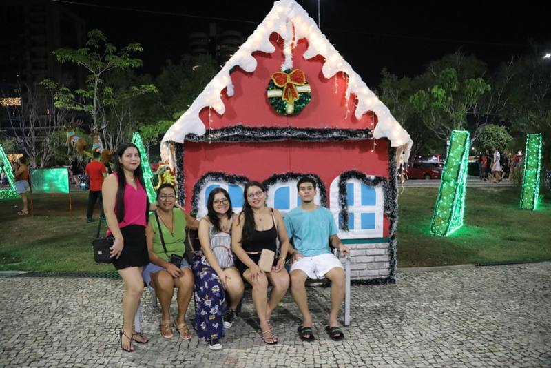 Os enfeites e a programação natalina atraíram a família do estudante Felipe Gomes, que agradeceu à prefeitura por poder compartilhar esse momento com namorada, mãe, madrinha e tia.