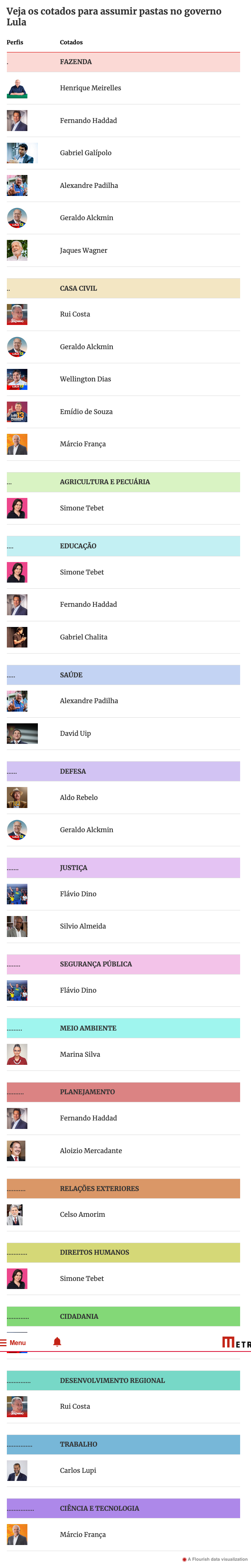 Derrotado na disputa pelo governo de São Paulo e nas últimas eleições presidenciais para o próprio Bolsonaro, o ex-prefeito da capital paulista é querido e respeitado por Lula. O professor chegou a ser ministro da Educação, mas descarta a possibilidade de voltar a assumir a pasta. Haddad, no entanto, indicou nomes para equipe que irá cuidar dos assuntos relativos à transição da educação e fará a coordenação de São Paulo. Esse distanciamento é mais um indicativo que ele não pretende aceitar um convite para ser ministro da Educação, caso isso ocorra. O mais provável é que o ex-prefeito fique à frente de pastas como Casa Civil e Planejamento.
