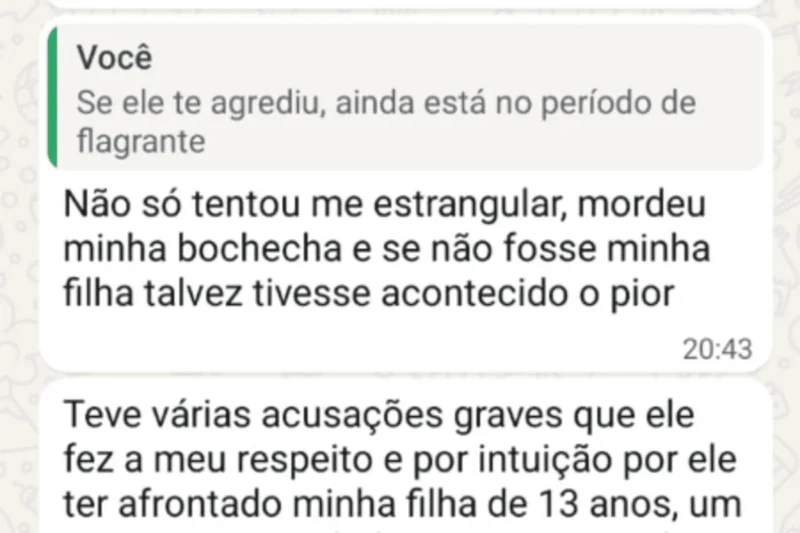 Ela seguiu: “Quase morri estrangulada, e preciso saber como funciona para prisão em flagrante. Ele é bem conhecido na cidade de Santo André. É major da polícia. Porém preciso de uma ação rápida para não acontecer o pior comigo e com minha filha”, afirmou em outra mensagem. Veja: