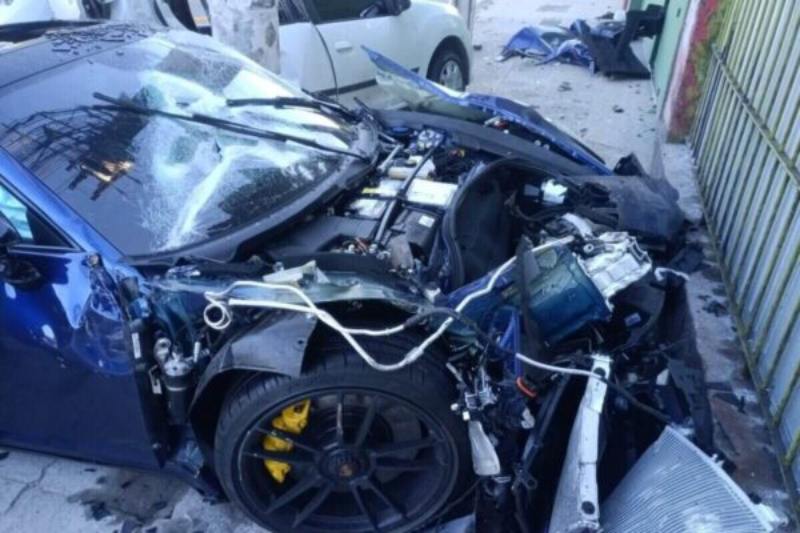 O Porsche ficou com a dianteira destruída por causa do acidente. A traseira do Renault Sandero também foi destroçada.