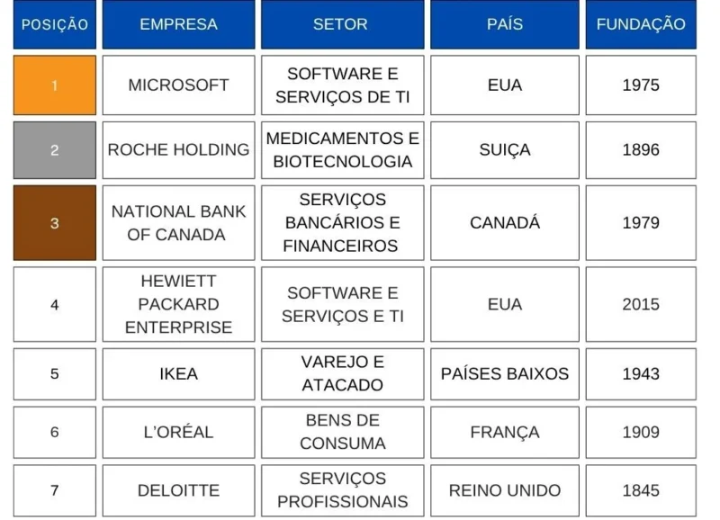 A segunda colocação é ocupada pela farmacêutica Roche Holding, seguida pelo National Bank of Canada, no terceiro lugar. Hewlett Packard Enterprise e IKEA completam o top 5.
