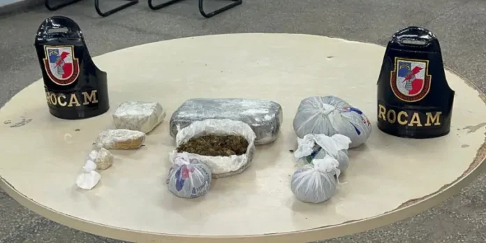 Durante as buscas, os militares encontraram porções de cocaína, maconha e pedras de oxi, além de um tablete e diversas quantidades de drogas já fracionadas, o que pode indicar comercialização.