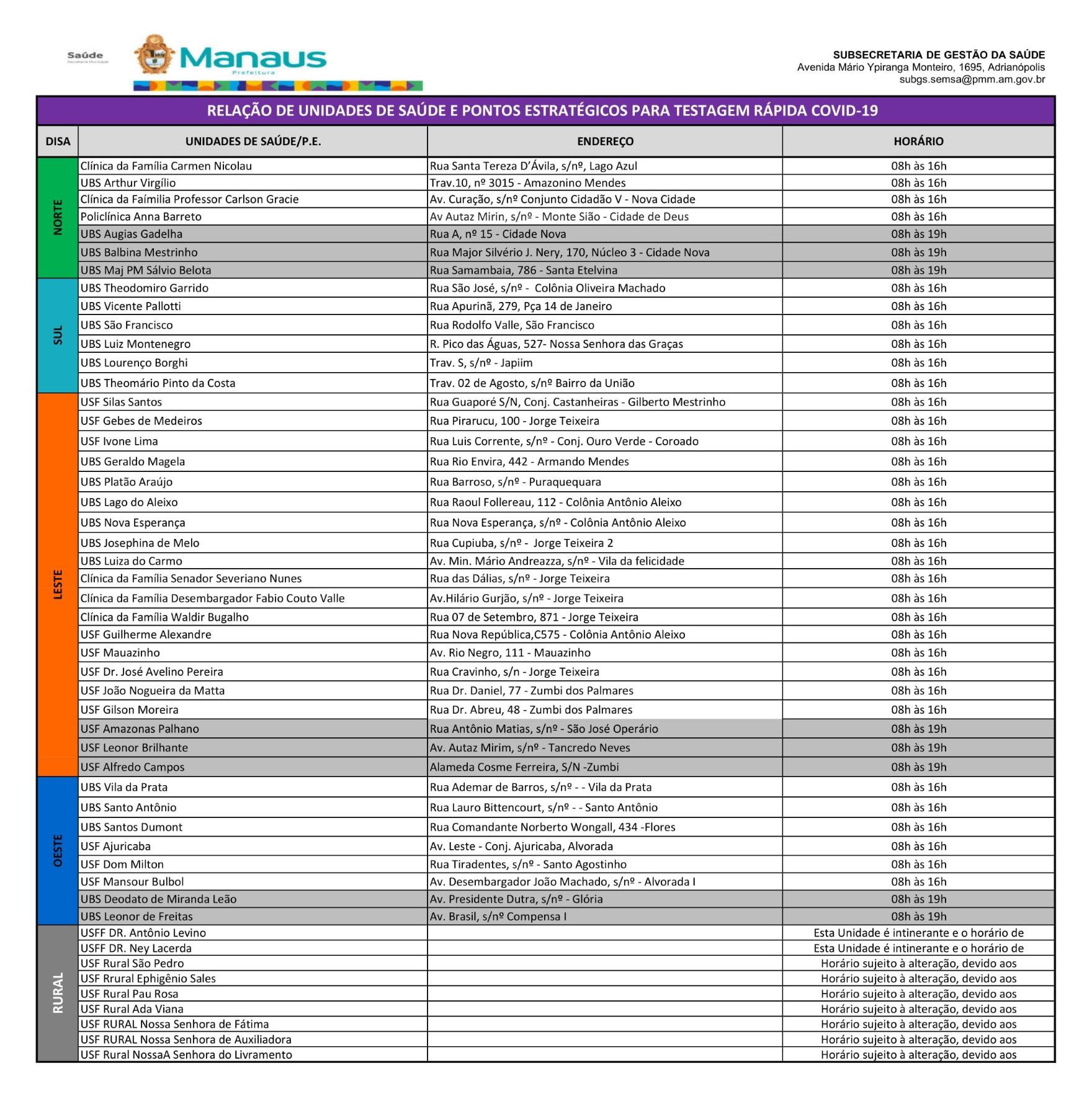 Para receber o atendimento os usuários devem apresentar documento de identificação original com foto e Cartão Nacional de Saúde (SUS). Os endereços e horários de atendimento das unidades de saúde que ofertam os testes rápidos podem ser conferidos pelo link: bit.ly/ubscovidmanaus.