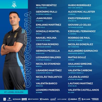 O técnico Lionel Scaloni anunciou, nesta segunda-feira (19/8), os jogadores convocados para defender a Seleção Argentina nos duelos contra Chile e Colômbia pelas Eliminatórias Sul-Americana da Copa do Mundo de 2026. O principal destaque da convocatória ficou com a ausência de Lionel Messi, que se recupera de lesão no tornozelo.