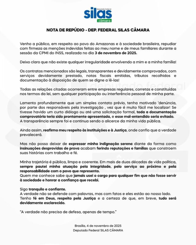 Na nota, Silas Câmara ressaltou sua trajetória pública de mais de duas décadas, afirmando que sempre pautou sua atuação pela integridade, serviço ao próximo e responsabilidade com o povo do Amazonas.