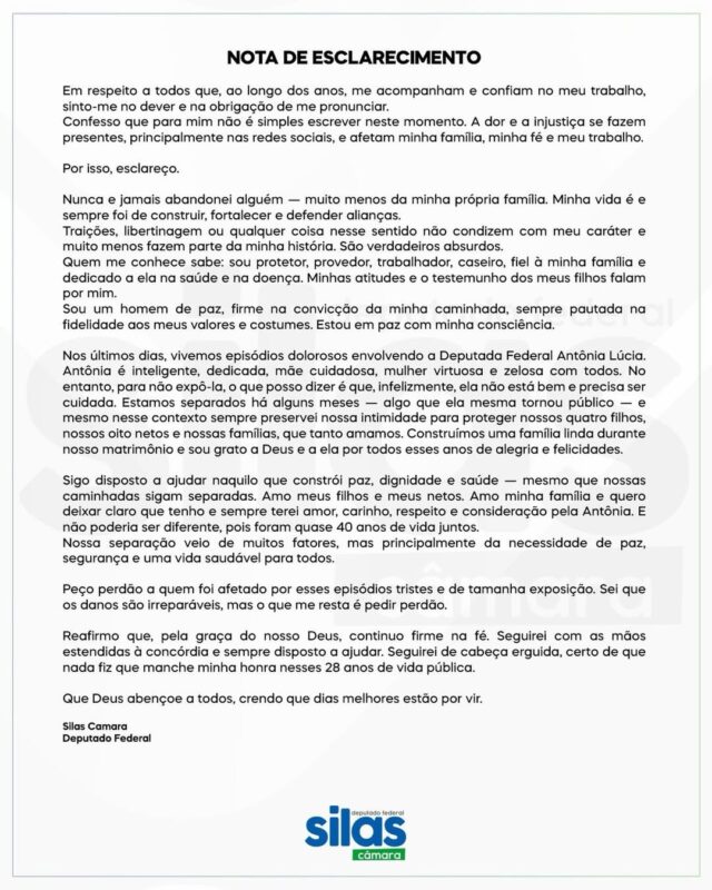 Na nota, Silas confirmou que o casal está separado há alguns meses, decisão que, segundo ele, está relacionada à necessidade de garantir tranquilidade e segurança para toda a família.