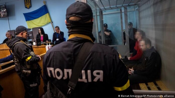 Durante a audiência no tribunal distrital de Kotelevska, no centro da Ucrânia, promotores públicos pediram que os soldados Alexander Bobikin e Alexander Ivanov sejam condenados a 12 anos de prisão por violarem as leis da guerra.