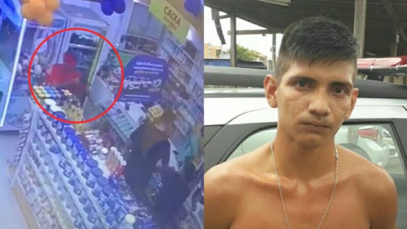 Vídeos de câmera de segurança circulam nas redes sociais mostrando o momento em que dois homens entram na farmácia a atiram no policial. Um suspeito estava de camisa e boné da cor vermelha e calça escura.