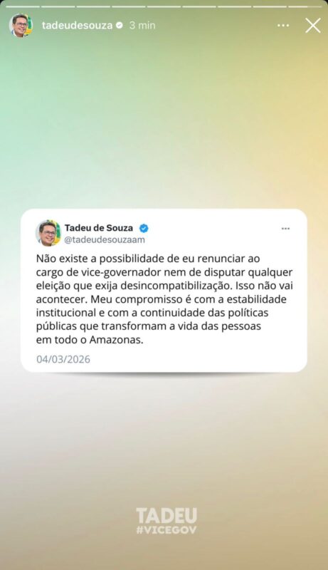 O vice-governador Tadeu de Souza (Progressistas) decidiu, à exemplo do governador Wilson Lima (União), continuar no governo até o final do mandato. A decisão foi anunciada nas redes sociais nesta quarta-feira, 04, contrariando todas as previsões sobre uma possível se desincompatibilização para concorrer o governo.