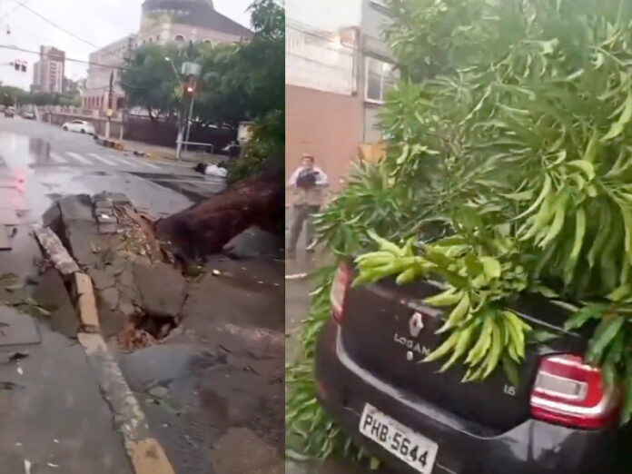 No centro da cidade, na rua 10 de Julho, uma árvore foi ao chão pela força do vento nas proximidades do Teatro Amazonas.