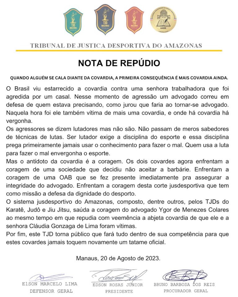 De acordo com a nota, o sistema jusdesportivo do Amazonas saúda a coragem do advogado Ygor de Menezes Colares, ferido com um tiro, e repudia com veemência a abjeta covardia de que ele e a babá Cláudia Gonzaga de Lima foram vítimas.