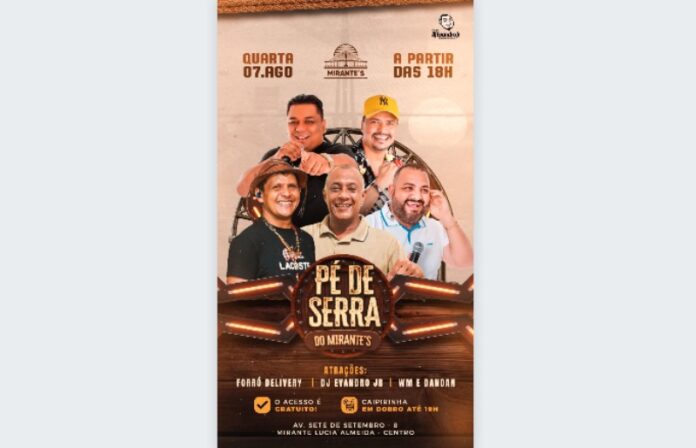 Happy hour com vista para o pôr do sol mais bonito da cidade ao som dos clássicos do forró é a pedida de toda quarta-feira no “Pé de Serra do Mirante’s”. A programação musical inicia às 18h, tem acesso gratuito, e promoção de caipirinha em dobro até 19h.