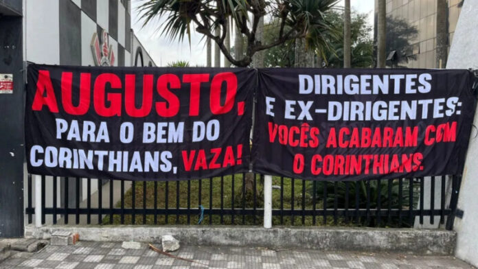 Durante a assembleia geral dos sócios que define o impeachment ou não de Augusto Melo, torcedores do Corinthians expuseram faixas de protesto contra o presidente afastado na entrada do Parque São Jorge.