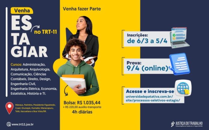 O Tribunal Regional do Trabalho da 11ª Região (AM/RR) abriu, nesta sexta (6/3), inscrições para estágio remunerado em diversas áreas do ensino superior. O processo selecionará candidatos através de prova objetiva online, com vagas que serão válidas para todos os municípios que possuem atuação do TRT-11. O estágio oferece uma bolsa mensal de R$1.035,44, mais um auxílio-transporte de R$220.